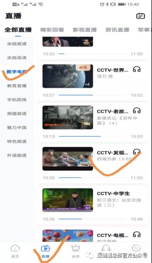 2、下载后,打开CCTV手机电视,点击直播,然后点击数字电视,最后点击CCTV-发现之旅